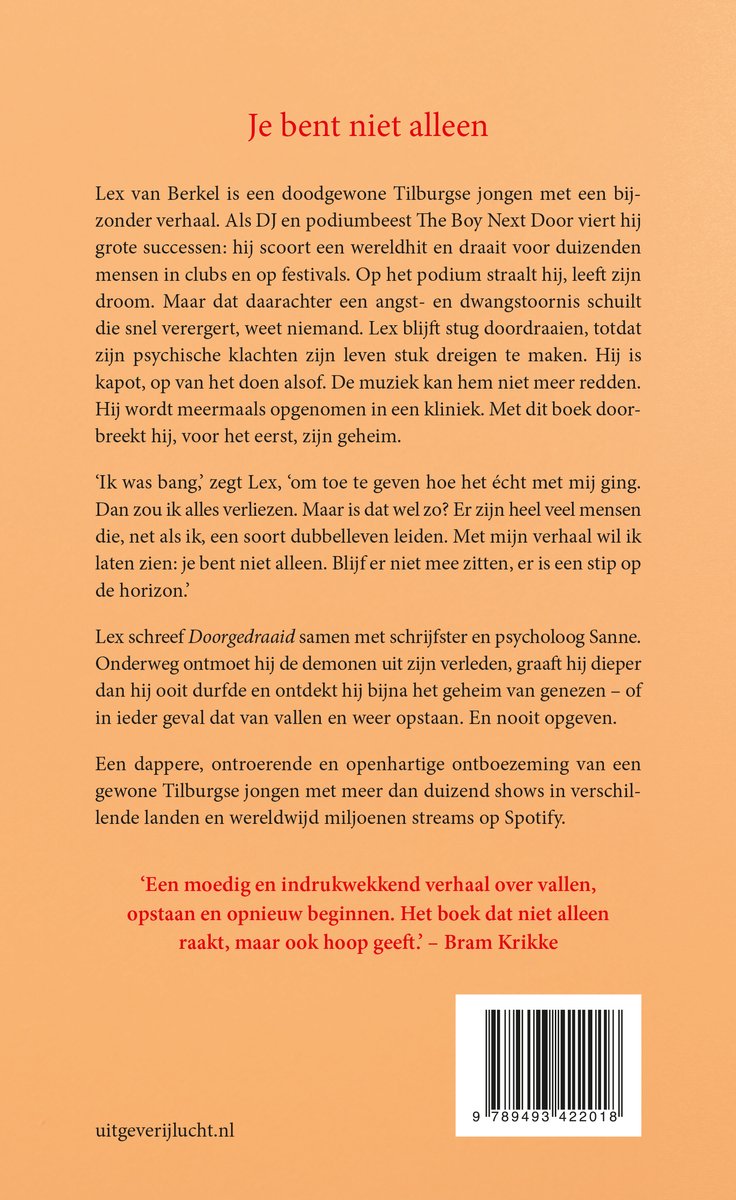 Lex van Berkel is een doodgewone Tilburgse jongen met een bijzonder verhaal. Als DJ en podiumbeest The Boy Next Door viert hij grote succes- sen: hij scoort een wereldhit en draait voor duizenden mensen in clubs en op festivals. Op het podium straalt hij, leeft zijn droom. Maar dat daarachter een angst- en dwangstoornis schuilt die snel verergert, weet niemand. Lex blijft stug doordraaien, totdat zijn psychische klachten zijn leven stuk dreigen te maken. Hij is kapot, op van het doen alsof. De muziek kan hem niet meer redden. Hij wordt meermaals opgenomen in een kliniek. Met dit boek doorbreekt hij, voor het eerst, zijn geheim. ‘Ik was bang,’ zegt Lex, ‘om toe te geven hoe het écht met mij ging. Dan zou ik alles verliezen. Maar is dat wel zo? Er zijn heel veel mensen die, net als ik, een soort dubbelleven leiden. Met mijn verhaal wil ik laten zien: je bent niet alleen. Blijf er niet mee zitten, er is een stip op de horizon.’ Lex schreef Doorgedraaid samen met schrijfster en psycholoog Sanne. Onderweg ontmoet hij de demonen uit zijn verleden, graaft hij dieper dan hij ooit durfde en ontdekt hij bijna het geheim van genezen – of in ieder geval dat van vallen en weer opstaan. En nooit opgeven. Een dappere, ontroerende en openhartige ontboezeming van een gewone Tilburgse jongen met meer dan duizend shows in verschillende landen en wereldwijd miljoenen streams op Spotify.