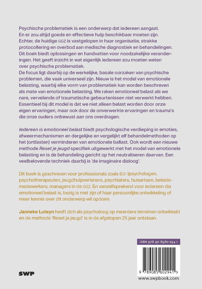 'Iedereen is emotioneel belast' biedt psychologische verdieping in emoties, afweermechanismen en dergelijke en vergelijkt elf behandelmethoden op het (ontlasten) verminderen van emotionele ballast. Ook wordt een nieuwe methode Reset je jeugd specifiek uitgewerkt met het model van emotionele belasting en is de behandeling gericht op het neutraliseren daarvan. Een veelbelovende techniek daarbij is ‘de imaginaire dialoog’.