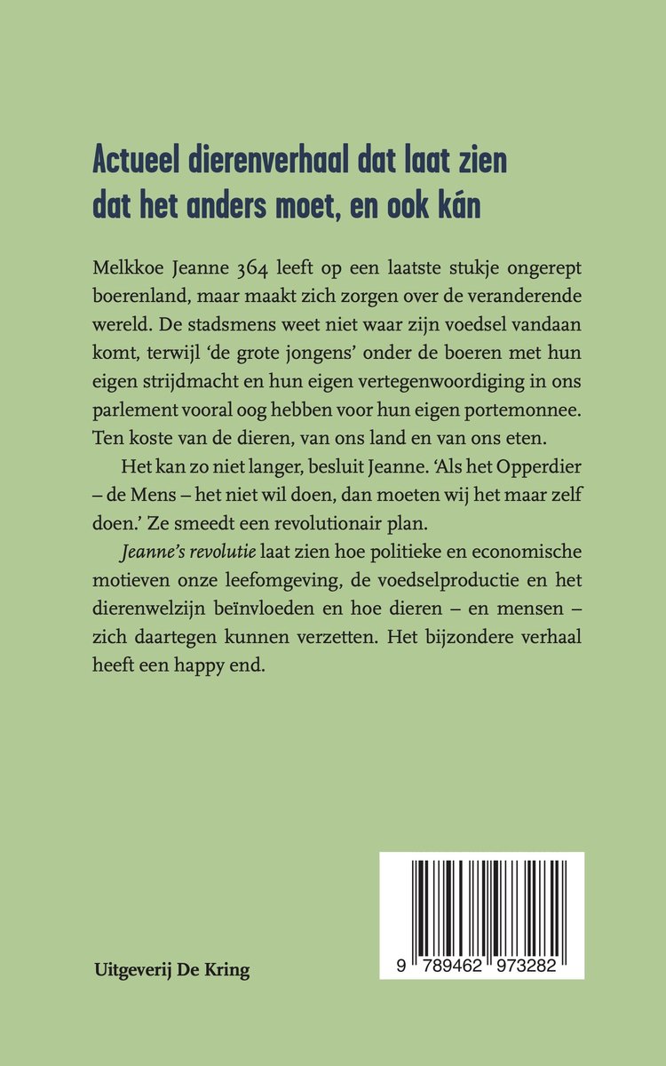 Actueel dierenverhaal dat laat zien dat wij beter met land en dier om moeten gaan. ***** Melkkoe Jeanne 364 leeft op een laatste stukje ongerept boerenland, maar maakt zich zorgen over de veranderende wereld. De stadsmens weet niet waar zijn voedsel vandaan komt, terwijl ‘de grote jongens’ onder de boeren met hun eigen strijdmacht en hun eigen vertegenwoordiging in ons parlement vooral oog hebben voor hun eigen portemonnee. Ten koste van de dieren, van ons land en van ons eten. Het kan zo niet langer, besluit Jeanne. ‘Als het Opperdier – de Mens – het niet wil doen, dan moeten wij het maar zelf doen.’ Ze smeedt een revolutionair plan. JEANNE'S REVOLUTIE laat zien hoe politieke en economische motieven onze leefomgeving, de voedselproductie en het dierenwelzijn beïnvloeden en hoe dieren – en mensen – zich daartegen kunnen verzetten. Het bijzondere verhaal heeft een happy end.