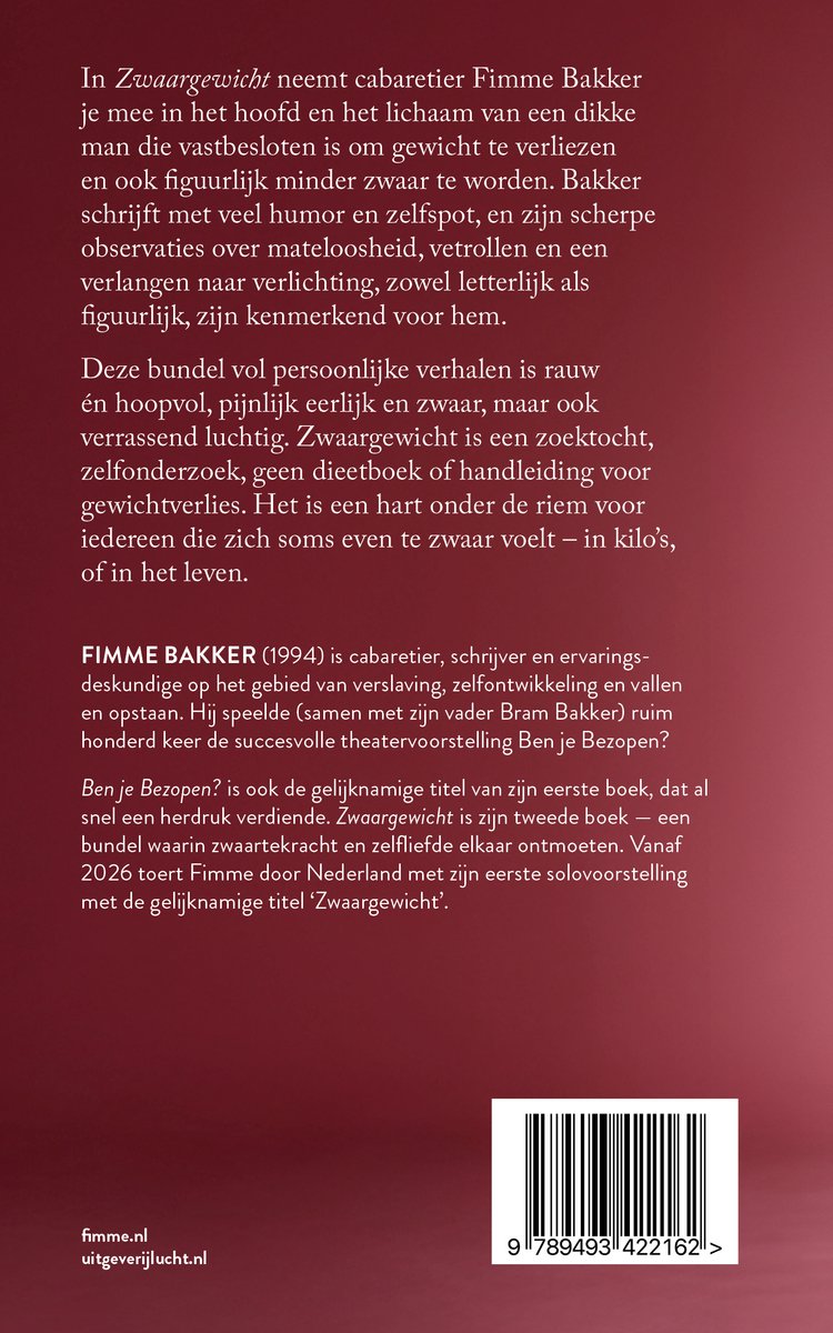 In Zwaargewicht neemt cabaretier Fimme Bakker je mee in het hoofd en het lichaam van een dikke man die vastbesloten is om gewicht te verliezen en ook figuurlijk minder zwaar te worden. Bakker schrijft met veel humor en zelfspot, en zijn scherpe observaties over mateloosheid, vetrollen en een verlangen naar verlichting, zowel letterlijk als figuurlijk, zijn kenmerkend voor hem. Deze bundel vol persoonlijke verhalen is rauw én hoopvol, pijnlijk eerlijk en zwaar, maar ook verrassend luchtig. Zwaargewicht is een zoektocht, zelfonderzoek, geen dieetboek of handleiding voor gewichtsverlies. Het is een hart onder de riem voor iedereen die zich soms even te zwaar voelt – in kilo’s, of in het leven. FIMME BAKKER (1994) is cabaretier, schrijver en ervaringsdeskundige op het gebied van verslaving, zelfontwikkeling en vallen en opstaan. Hij speelde (samen met zijn vader Bram Bakker) ruim honderd keer de succesvolle theatervoorstelling Ben je Bezopen? Ben je Bezopen? is ook de gelijknamige titel van zijn eerste boek, dat al snel een herdruk verdiende. Zwaargewicht is zijn tweede boek — een bundel waarin zwaartekracht en zelfliefde elkaar ontmoeten. Vanaf 2026 toert Fimme door Nederland met zijn eerste solovoorstelling met de gelijknamige titel ‘Zwaargewicht’.