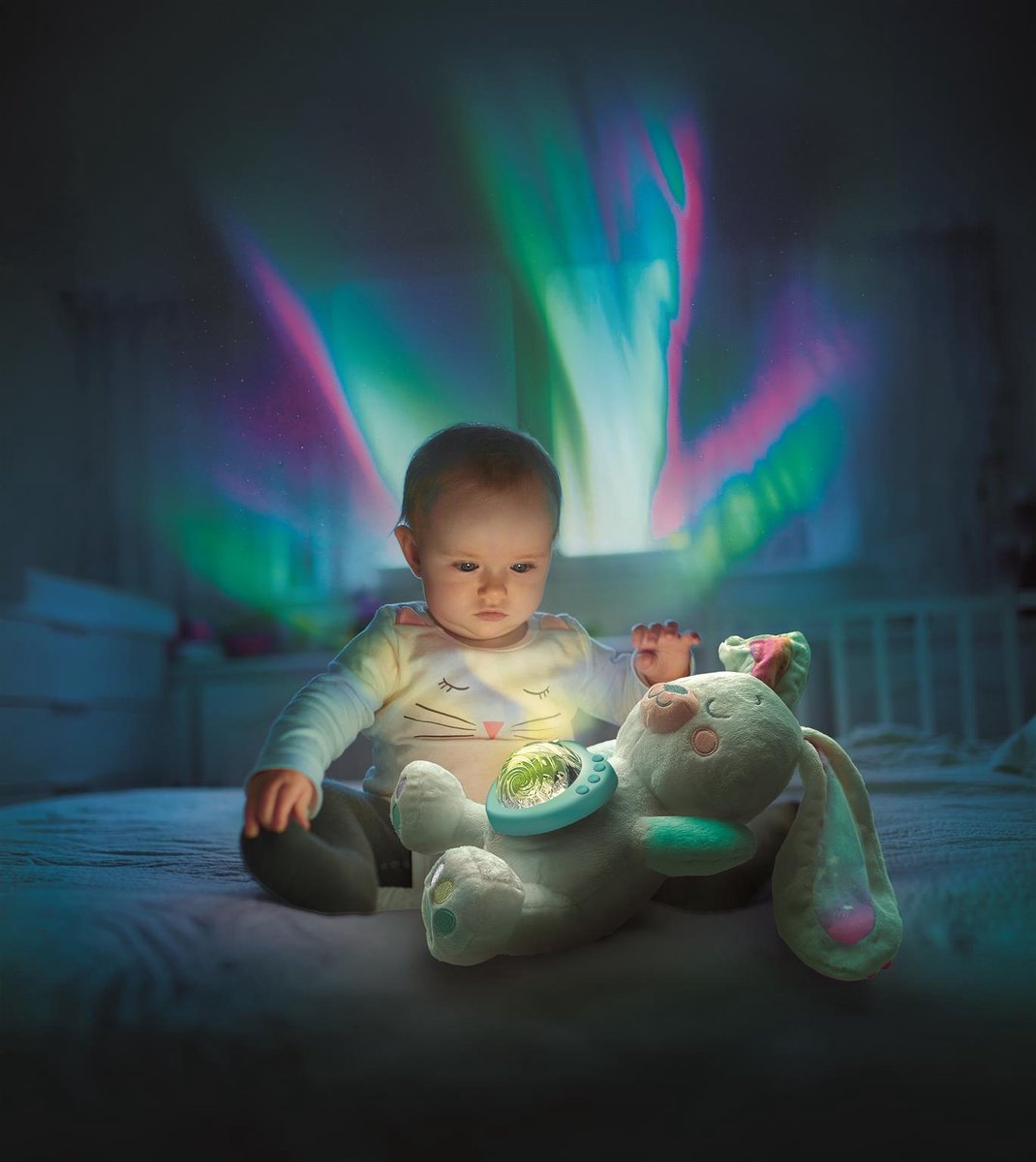 Een heel zacht poolhaasje dat het noorderlicht uitstraalt. Een perfecte reisgenoot voor de kleintjes in dromenland. Het noorderlicht wordt uitgestraald met wel 10 verschillende kleuren en schept zo een magische omgeving waarin het kind zich gemakkelijker ontspant. Het haasje maakt witte geluiden en melodieën die speciaal zijn bedacht om het kind te kalmeren, waardoor het zelfstandig overgaan van waken naar slapen wordt bevorderd. Product 0m+, geschikt voor kinderen vanaf een paar maanden oud: met het oog op de hygiëne kan de module eruit worden gehaald en kan de knuffel in de wasmachine worden gewassen. Ontdek de speciale producten om zelf in te slapen van de lijn Baby Clementoni for you: het poesje en de leuke nachtdieren Twinkle Twinkle begeleiden je kind bij het inslapen.